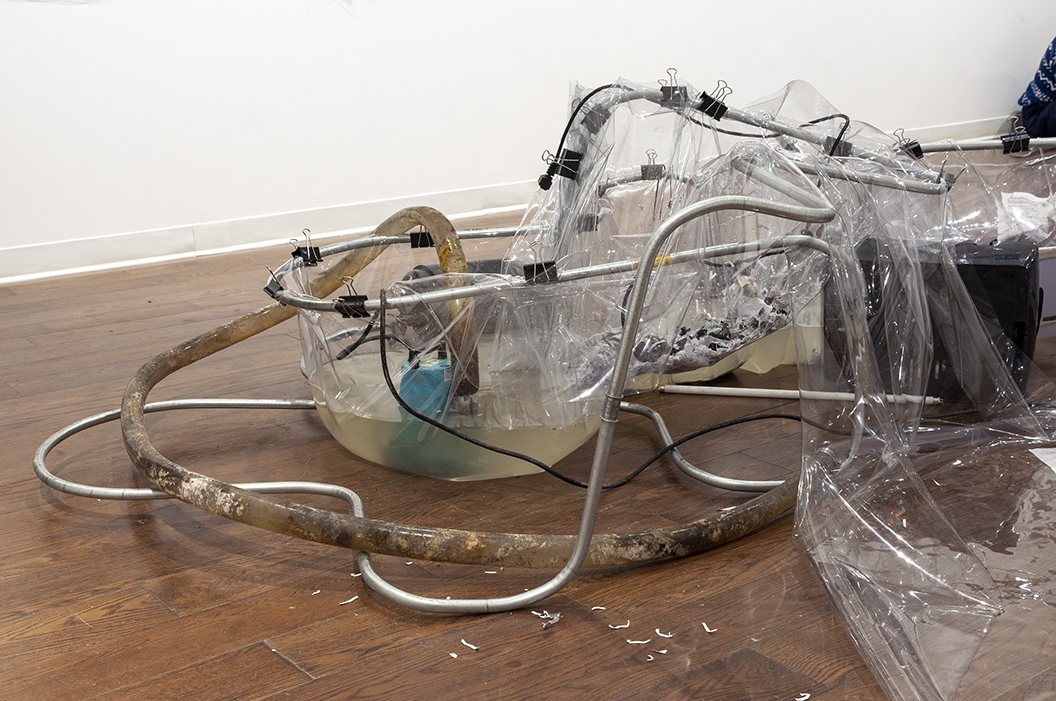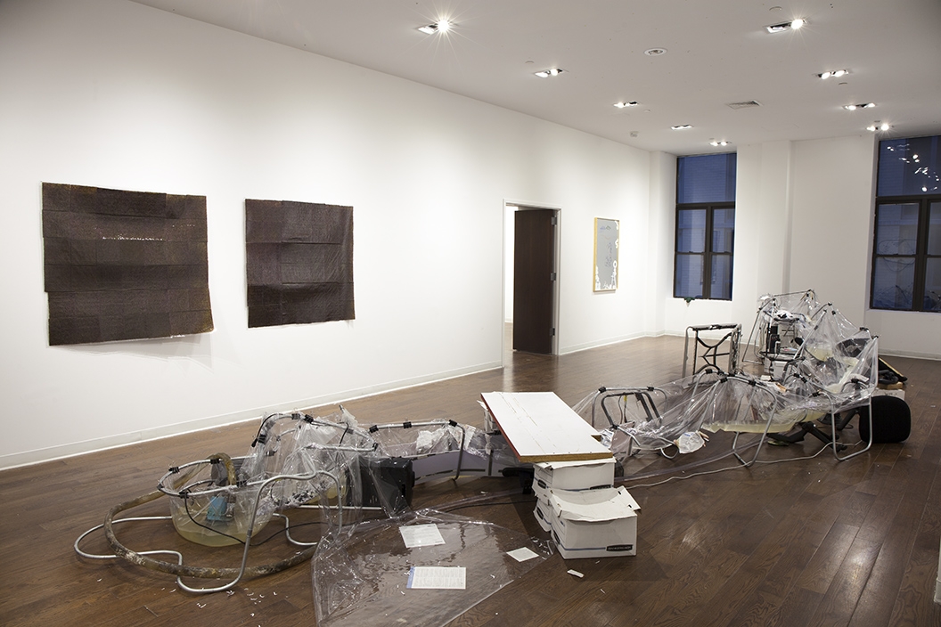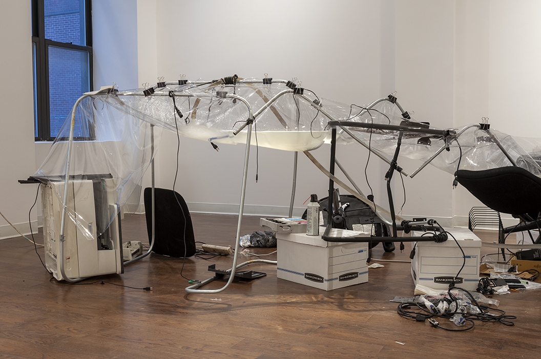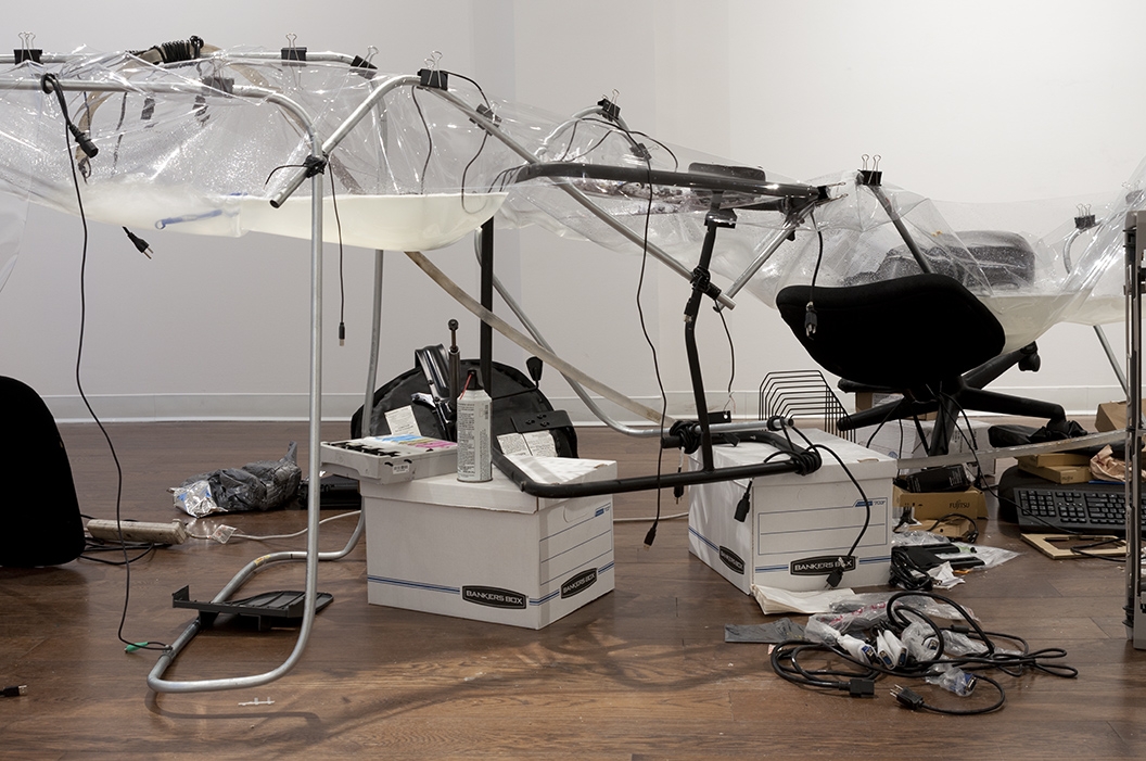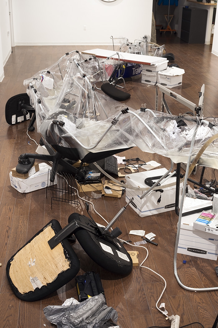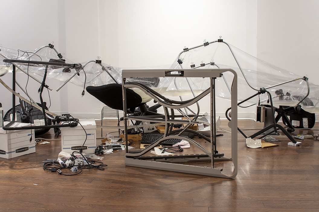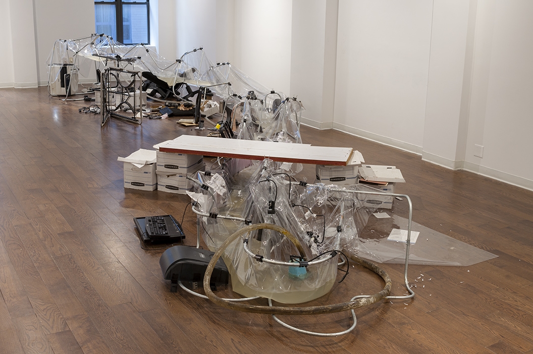 Revenue Stream (2015) was part of a four-person show at an exhibition space in Manhattan located inside a law firm's office. The discarded office supplies that constructed the stream came from dumpsters in the Financial District.